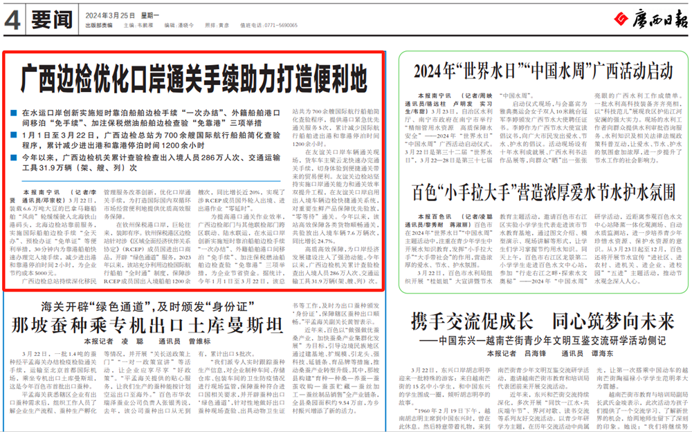■ 1月1日至3月22日,广西边检总站为700余艘国际航行船舶简化查验程序,累计减少进出港和靠港停泊时间1200余小时