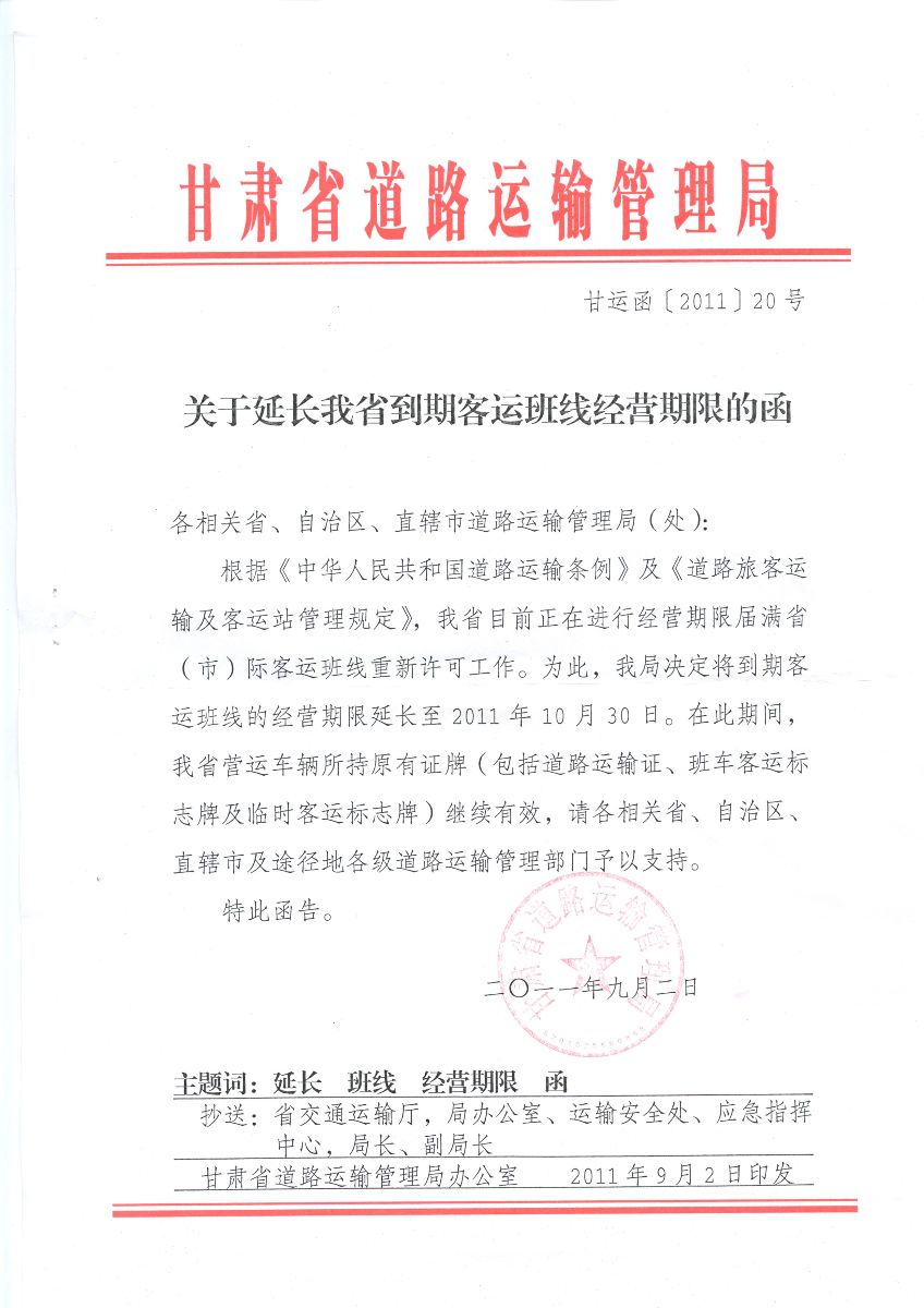 转发甘肃省运管局关于延长到期客运班线经营期限的通知