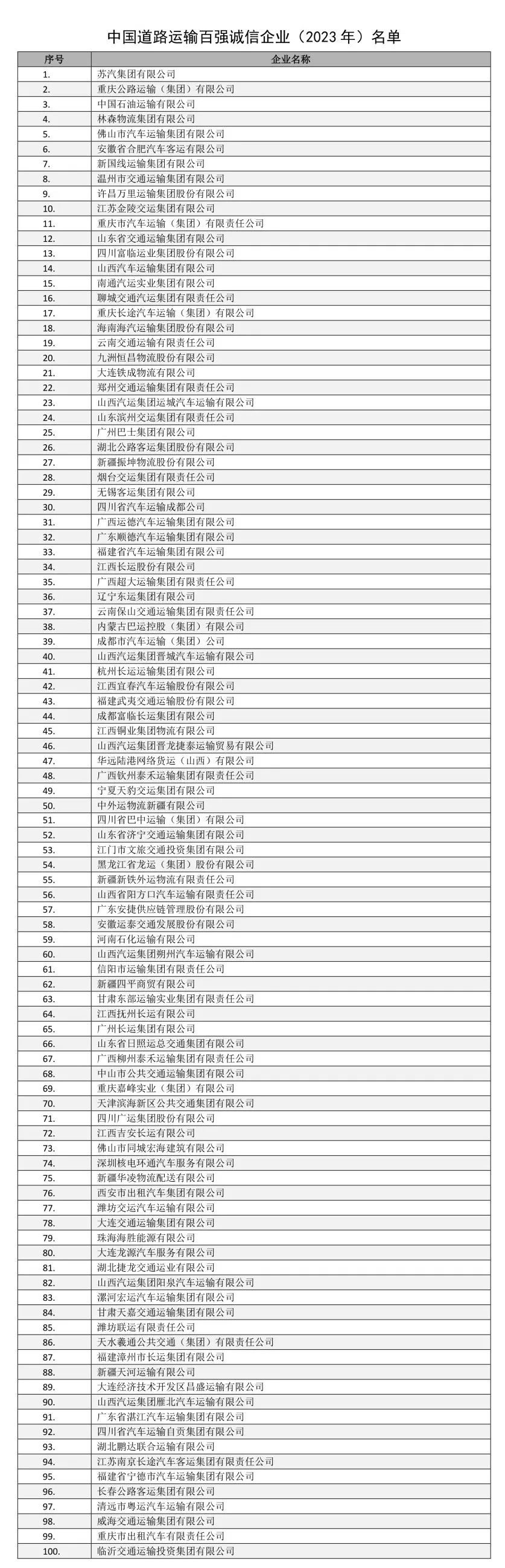 中国道路运输协会发布中国道路运输百强诚信企业(2023年)名单