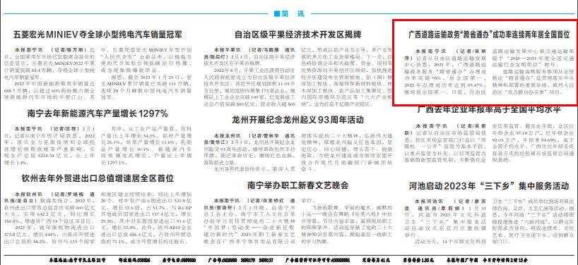 道路运输高频服务事项从业资格证“跨省通办”是贯彻落实中央精神和部署的重要举措,被列入自治区“我为群众办实事”项目。(转载自《广西日报》2023年2月2日)