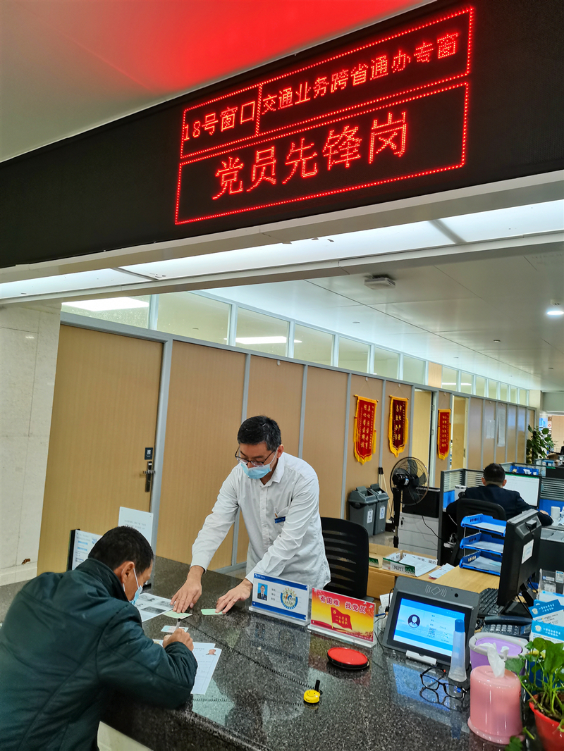 图为南宁市行政审批局交通运输窗口党员先锋岗工作人员在指导驾驶员办理从业资格证“跨省通办”业务。