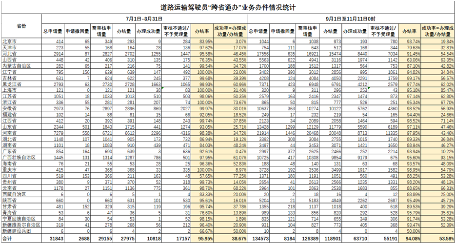 附:交通运输部发布 7 月 1 日-11 月 11 日互联网道路运输便民运政服务系统道路运输驾驶员“跨省通办”业务办件统计表
