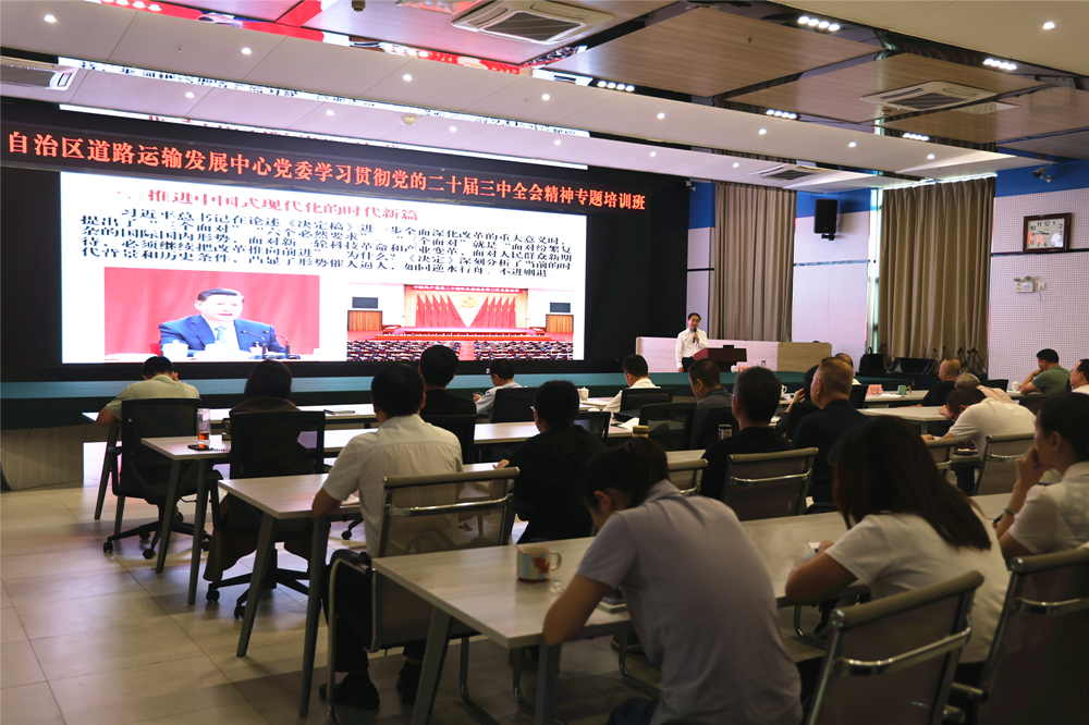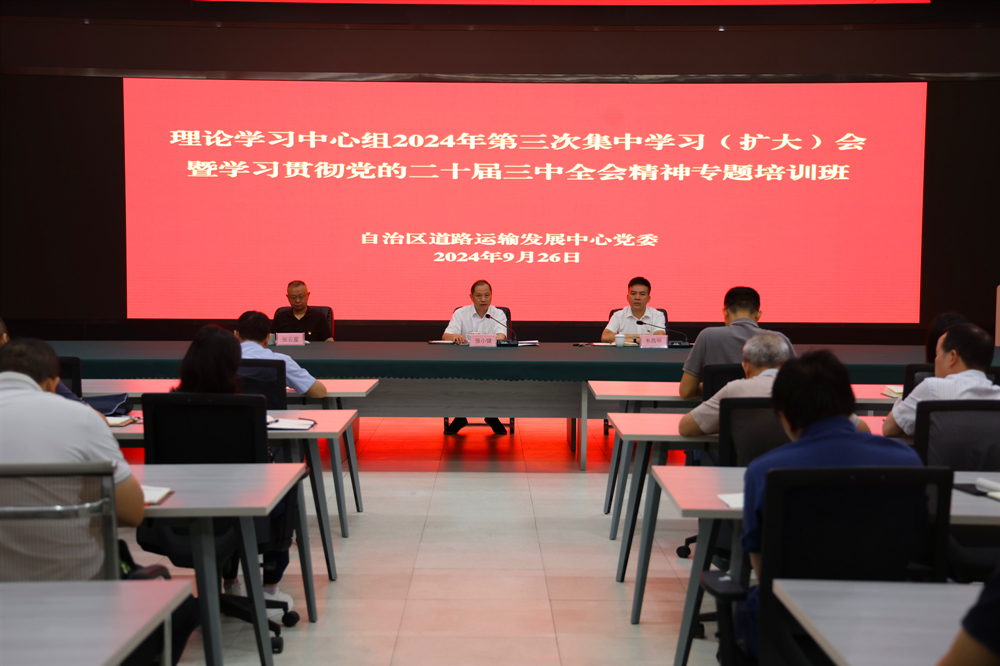 9月26日,自治区道路运输发展中心召开党委理论学习中心组2024年度第三次学习(扩大)会暨学习贯彻党的二十届三中全会精神专题培训班。中心党委书记、主任张小健主持学习会,中心在家领导、党员干部职工及广西道路运输协会党员参加会议。