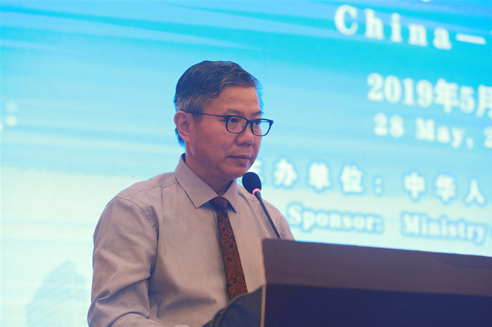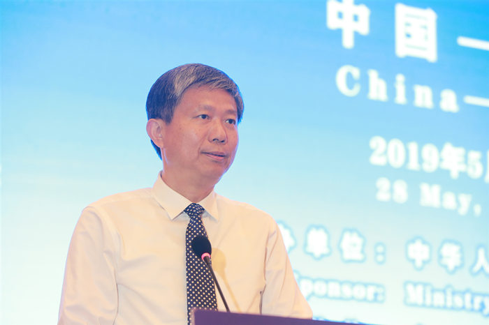图为:中国国家便利运输委员会副主席、广西壮族自治区副主席费志荣致辞