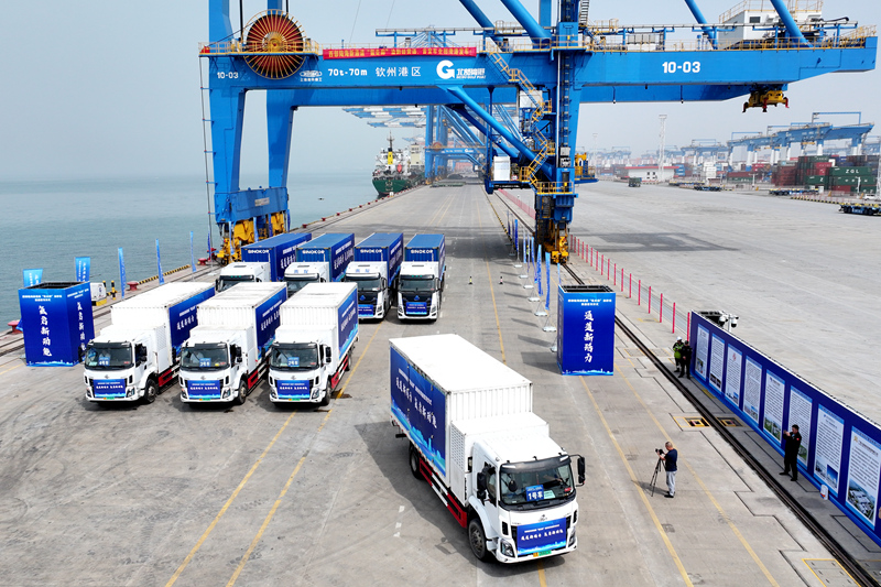 当天,在广西钦州港,随着汽车鸣笛声响起,8辆分别装载化工原料、机械设备、电器等货物的氢能重卡正式发车。它们将途经南宁、百色,历时约3天到达重庆、贵阳等地,中途这些车辆可在沿线加氢站补充氢气能源。